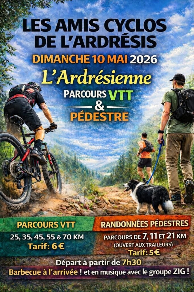 L’Ardésienne VTT Quand mai 10, 2026 07:30 Ajouter au Calendrier Télécharger ICS Calendrier Google iCalendar Office 365 Outlook Live Où Ferme du bastion - Ardres Place Belle Roze, Ardres, 62610 Carte non disponible https://www.amis-cyclos-ardresis.fr/